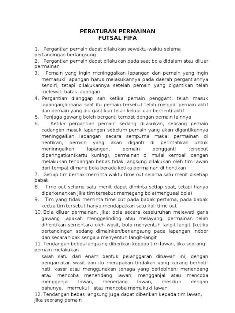 Namun sebelumnya harus melalui sentuhan. Download View Peraturan Permainan Futsal Fifa Lengkap as PDF for free. Tetapi permainan ini pertama diperkenalkan di Montevideo Uruguay pada tahun 1930.